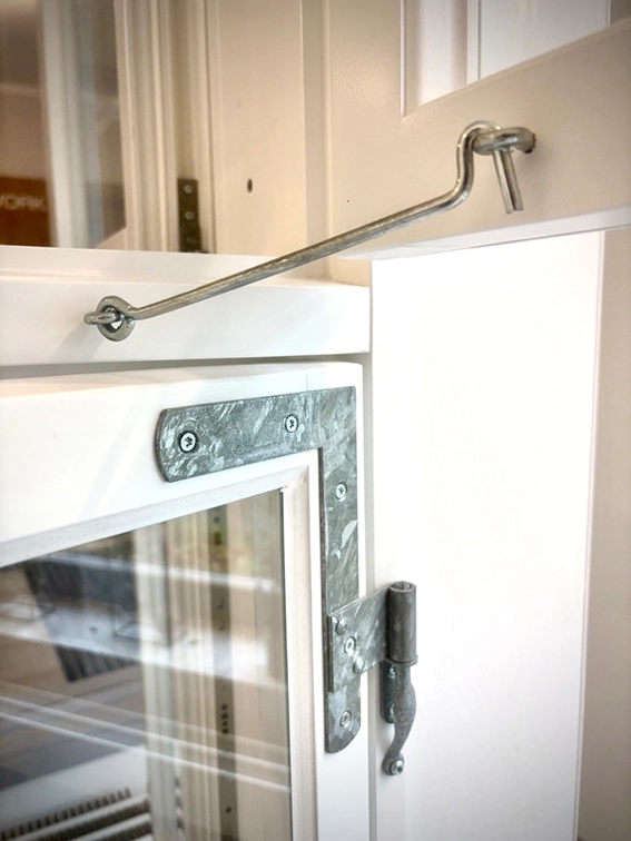 Der Sturmhaken hält den geöffneten Flügel sicher in Position – auch bei starkem Wind. Besonders an der Küste oder bei historischen Fenstern ist er ein unverzichtbares, funktionales Detail.