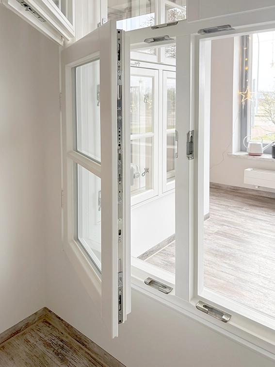 Unsere außenöffnenden Holzfenster vereinen skandinavische Funktionalität mit deutscher Handwerkskunst. Typische Details wie gekröpfte Oliven und eingelassene Schließstücke unterstreichen die hochwertige Verarbeitung – sichtbar schön, fühlbar präzise.